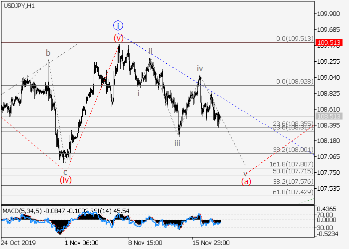4小时图中, (C)的1 的第一波i已发展,下行修正已形成为1的波ii。目前,ii的波(a)正在发展,其中(a)的较低水平v的第五波正在形成。如果假设正确,价格将会跌至106.95–106.35。该情况的关键止损水平为109.51。