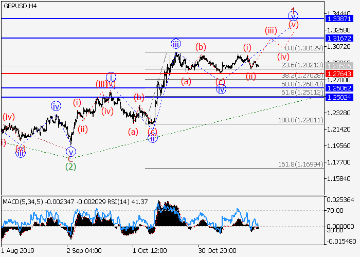 4小时图中,第一波1在较高水平的第三开始波(3)中发展。目前,下行修正已结束为1的波iv,1的第五波v正在发展,其中v的较低水平(i)的第一波已形成,v 的较低水平(ii)的修正已结束。如果假设正确,价格将会升至1.3167–1.3387。该情况的关键止损水平为1.2764。