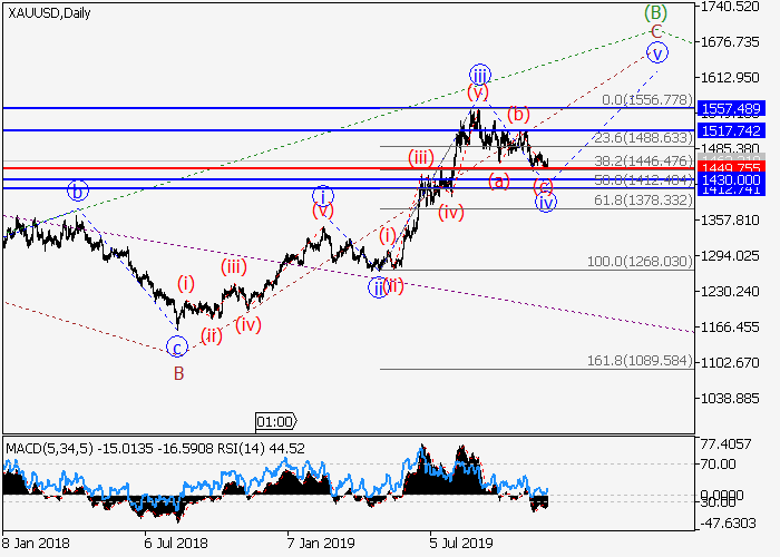 日线图中,上行趋势形成为(B)的较高水平C波,其中C的局部修正iv已结束。目前,iv的波(c)已发展,其中iv的(c)的较低水平v的第五波已形成。如果假设正确,价格将会升至1517.74–1557.48。该情况的关键止损水平为1449.75。