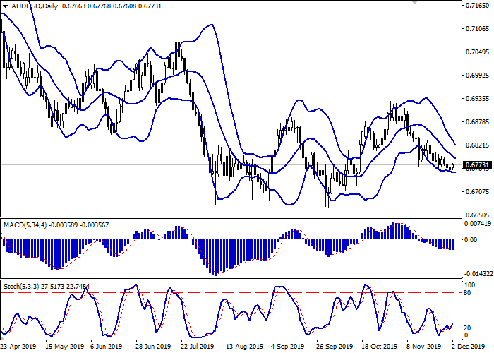 日线图中,布林带呈逐渐下降趋势。价格区间从下方收窄,反映出在新交易周伊始出现修正性增长。平滑异同移动平均线下跌,保持弱卖出信号(位于信号线以下)。随机指数正在从低点回升,表示超短期内超卖。