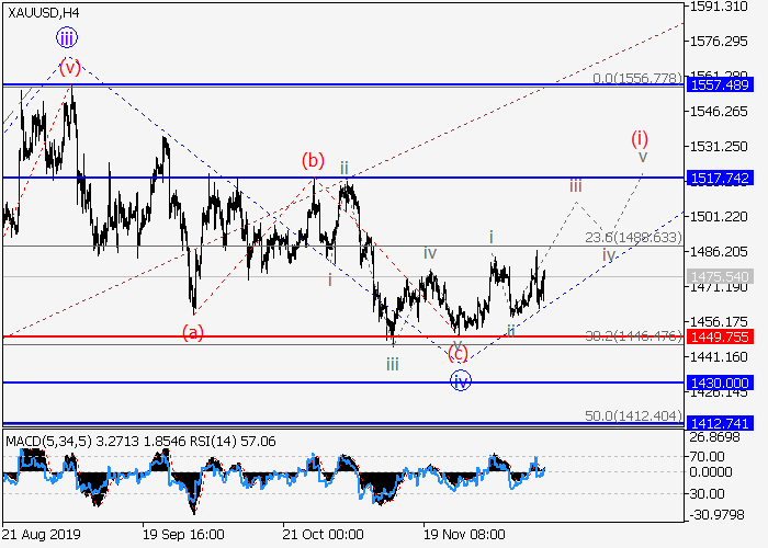 日线图中,上行趋势形成为(B)的较高水平C,其中C的局部修正iv已结束。目前,C的第五波v已开始形成,其中v的较低水平(i)的第一波正在发展。如果假设正确,价格将会升至1517.74–1557.48。该情况的关键止损水平为1449.75。