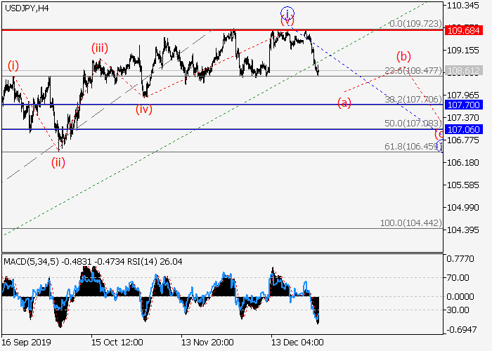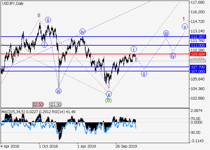 日线图中,较高水平的波(C)发展,其中(C)的第一波1形成。目前,较低水平的1的波i已发展,下行修正正开始形成1的波ii。如果假设正确,价格将会跌至107.70–107.06。该情况的关键止损水平为109.68。