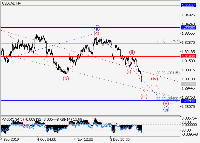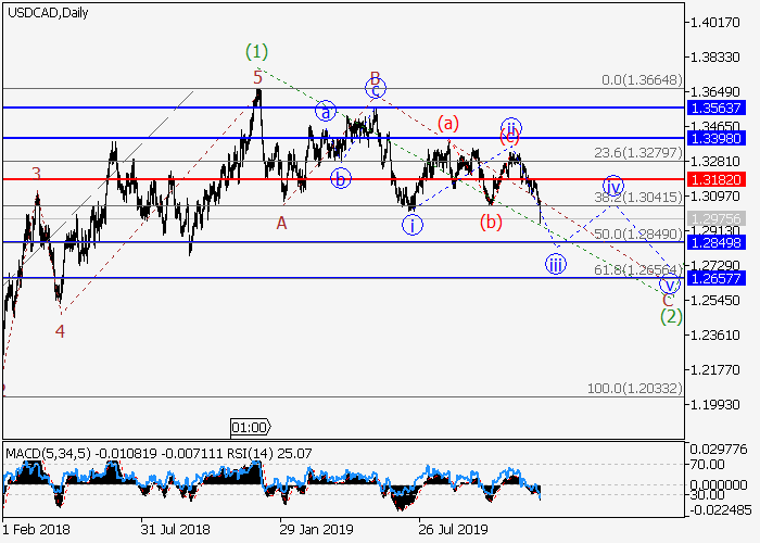 日线图中,较高水平(1)的第一波已发展,下行修正形成为波(2)。目前,(2)的波C正在发展,其中C的波iii正在形成。如果假设正确,价格将会跌至1.2849–1.2657。该情况的关键止损水平为1.3182。