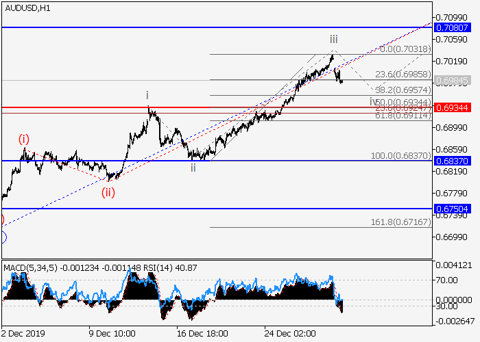 日线图中,(A)的较高水平1的第一波在发展,其中1的第一波i已形成,1的修正波ii已结束。目前,1的第三波iii正在形成,其中较低水平的iii的波(iii)正发展为动量。如果假设正确,价格将会升至0.7080–0.7159。该情况的关键止损水平为0.6934。