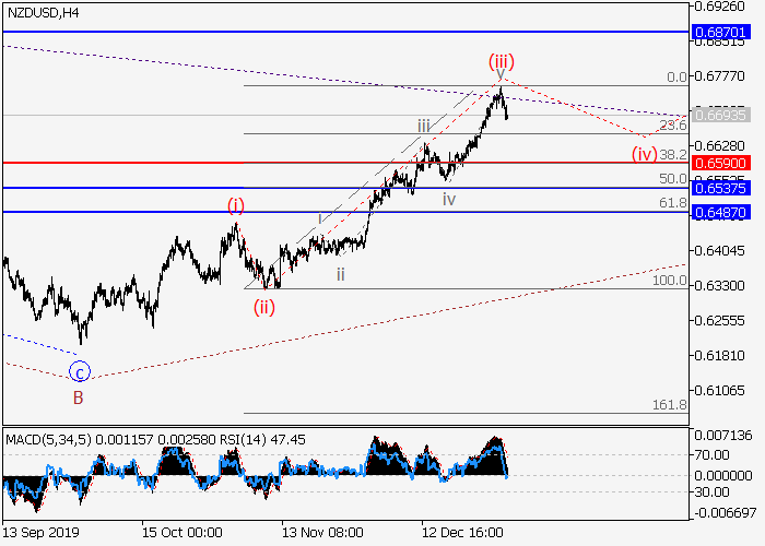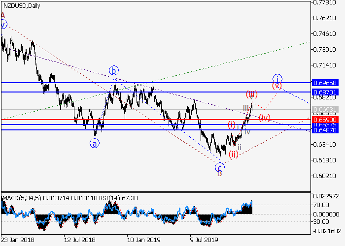 日线图中,较高水平的下行修正已发展为波B。目前波C已开始形成,其中C的较低水平i的第一个入市波正在发展。如果假设正确,价格将会升至0.6870–0.6965。该情况的关键止损水平为0.6590。
