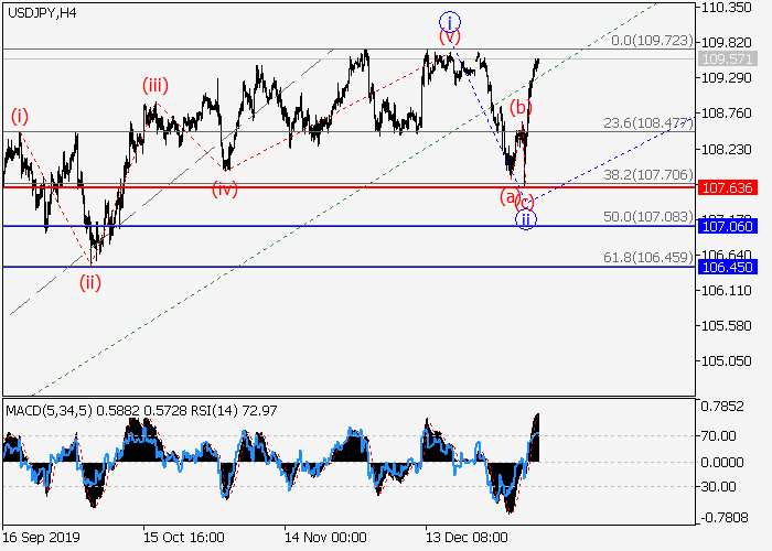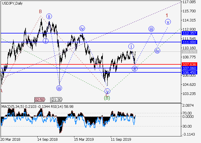 日线图中,较高水平的波(C)在发展,其中(C)的第一波1。目前,较低水平的1的波i已形成,下行修正已发展为1的波ii。如果假设正确,价格将在C的波iii中升至111.00–112.35。该情况的关键止损水平为107.63。
