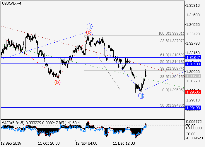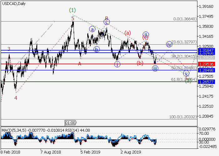 日线图中,下行修正形成为波(2),其中(2)的波C在发展。目前,C的第三波iii已形成,上行修正已开始发展为C的波iv。如果假设正确,价格将会升至1.3140–1.3184。该情况的关键止损水平为1.2953。