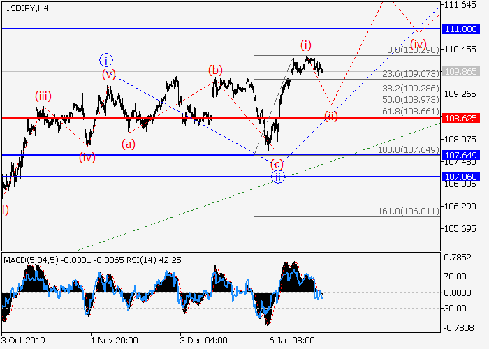日线图中,(C)的较高水平1的第一波形成。目前,1的较低水平iii波已开始形成,其中iii的较低水平(1)的第一波已形成。如果假设正确,iii的修正(ii)结束后,价格将会升至111.00–112.35。该情况的关键止损水平为108.62。