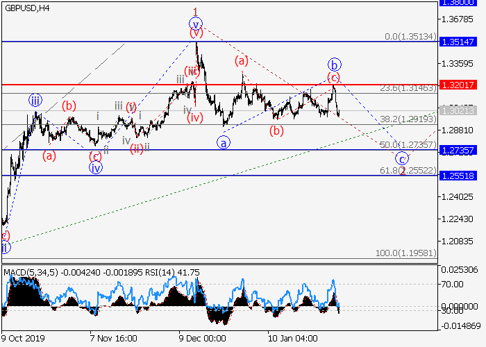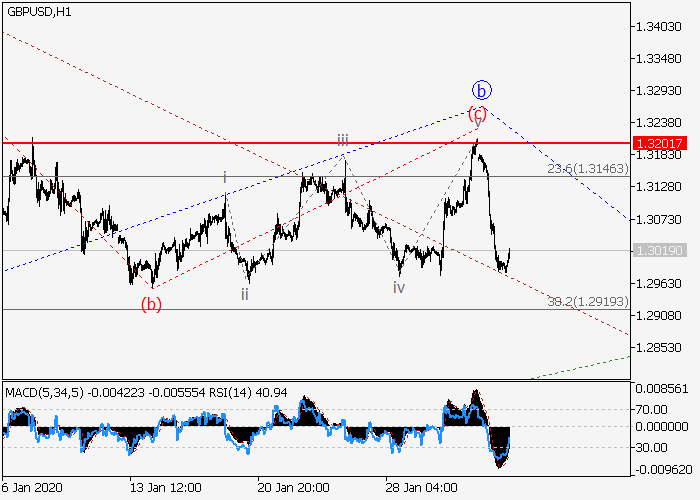4小时图中,(3)的较高水平1的第一波已完成发展,下行修正已形成为(3) 的波2。目前,2的波b已完成发展,2的波c已开始形成。如果假设正确,价格将会跌至1.2735–1.2551。该情况的关键止损水平为1.3201。