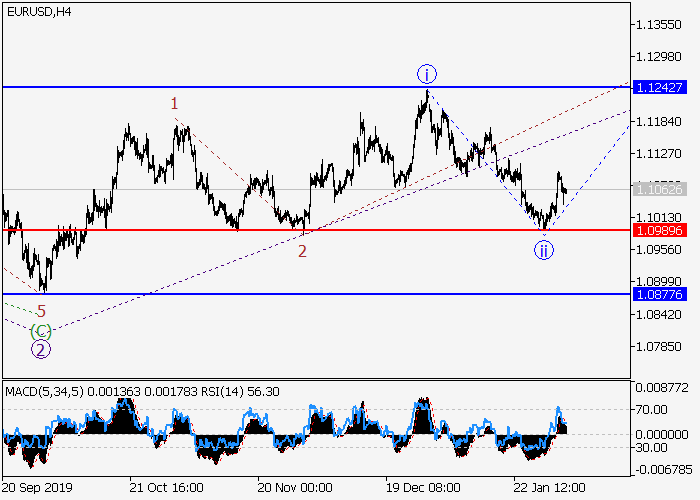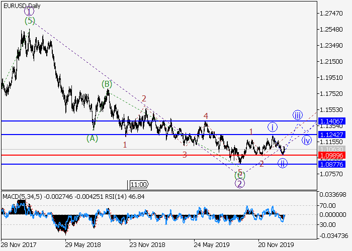 日线图中,较高水平的下行修正已完成发展为波2,波3开始形成。目前,(1)的第一个入市波1和1的i已形成,如果假设正确,价格可能会升至1.1242–1.1406。该情况的关键止损水平为1.0989。