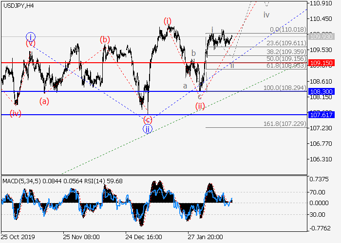 日线图中,C的较高水平(1)的第一波正形成,其中1的波iii正在发展。目前,iii的较低水平(iii)的第三波开始形成,其中(iii)的局部修正ii正完成。如果假设正确,价格将会继续上涨至111.50–112.35。该情况的关键止损水平为109.15。