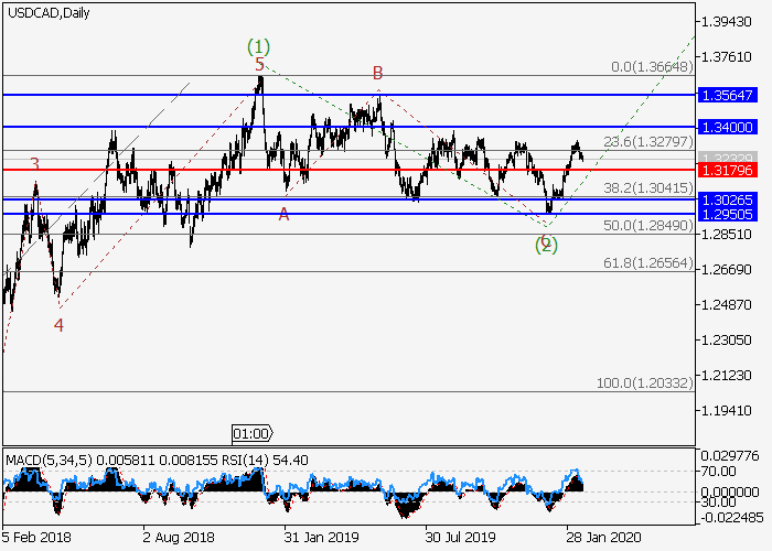 日线图中,较高水平的下行修正作为第二波(2)已形成,波(3)一开始发展。目前,(3)的1的i的较低水平(i)的第一个入市波已形成,其中(i)的波iii已完成,局部修正几乎已完成为(i)的波iv。如果假设正确,修正完成后,价格将继续升至1.3400–1.3564。该情况的关键止损水平为1.3179。