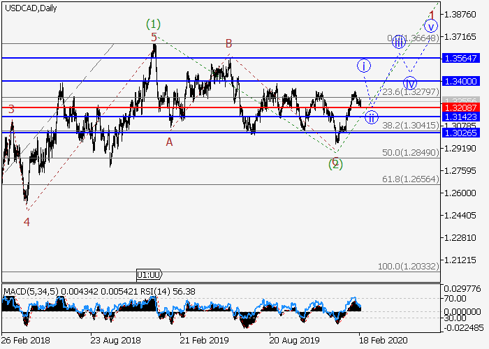 日线图中,较高水平的下行修正形成为第二波(2),波(3)已开始发展。目前,(3)的1的较低水平i正形成,其中局部修正已结束为i的波(iv)。如果假设正确,价格将会升至1.3400–1.3564。该情况的关键止损水平为1.3208。