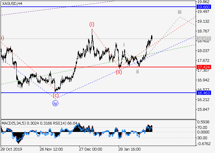 日线图中,(3)的较高水平1的第一波已形成,其中1的波v开始发展。目前,v的较低水平(i)的第一进入波已形成,v的波(ii)为已结束的局部修正。如果假设正确,价格将升至19.66–21.00。该情况的关键止损水平为17.42。