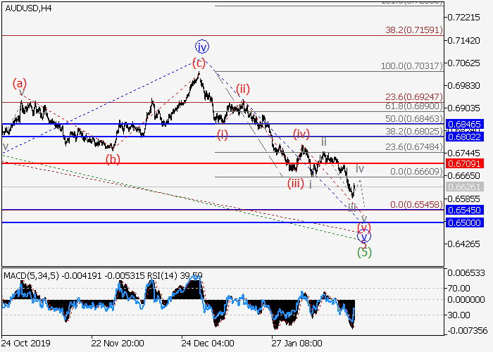 4小时图中,(5)的较高水平5的第五波已发展,其中5的波v已形成。目前,v的较低水平(v)的第五波正在发展,其中,(v)的波iii已形成,修正正在发展成为(v)的波iv。如果假设正确,该货币对将跌至0.6545–0.6500。该情况的关键止损水平为0.6709。