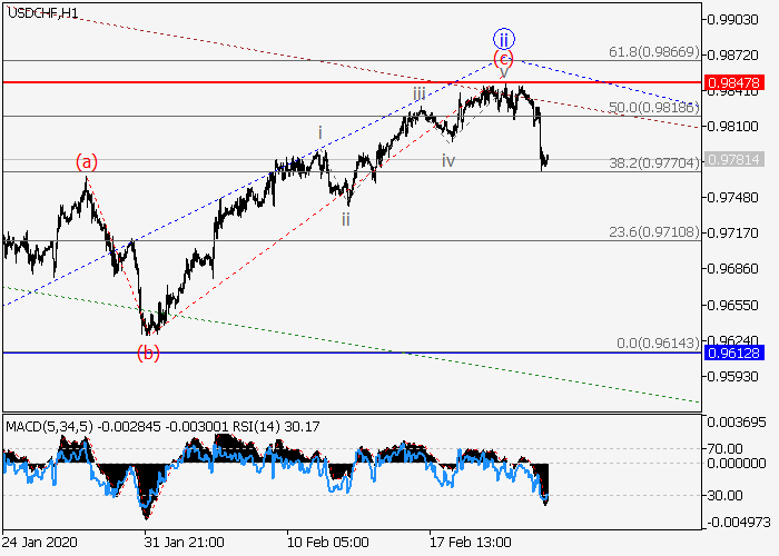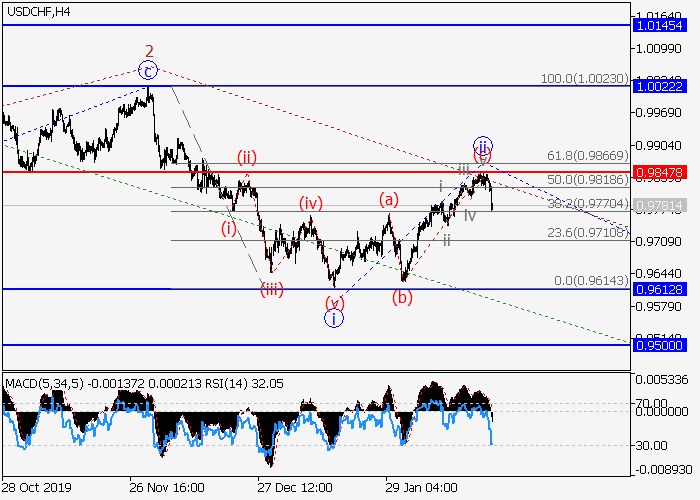 4小时图中,较高水平(3)的第三波已发展,其中(3)的波3已形成。目前,3的较低水平i的第一波已形成,3的波ii为已结束的局部修正。如果假设正确,该货币对将跌至0.9612–0.9500。该情况的关键止损水平为0.9847。