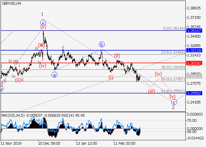 日线图中,(3)的较高水平1的第一波已形成,下行修正发展为(3)的波2。目前,2的波c正形成,其中c的波(iii)正在发展。如果假设正确,价格将会跌至1.2555–1.2185。该情况的关键止损水平为1.3018。