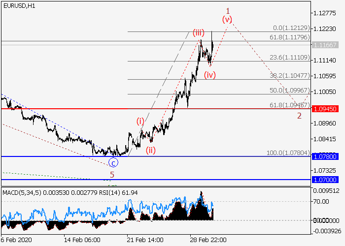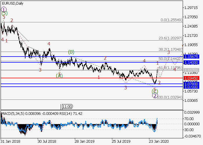 日线图上,较高水平的下行修正已发展为第二波2,其中2的波(C)已形成有限对角三角形。目前,波3一开始发展,其中3的(1)的较低水平1的第一个入市波正结束形成。如果假设正确,(1)的局部修正2结束后,该货币对将会升至1.1400–1.1567。该情况的关键止损水平为1.0945。