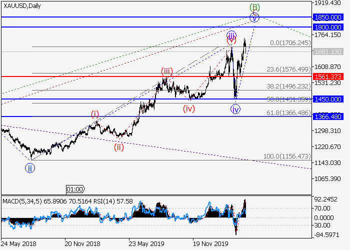 日线图中,较高水平的上行修正形成为波(B),其中(B)的波C在发展。目前,C的较低水平iii的第三波已形成,局部修正已结束为C的第四波iv,C的波v正在发展,其中v的波(iv)正在形成。如果假设正确,价格将会升至1800.00–1850.00。该情况的关键止损水平为1561.37。