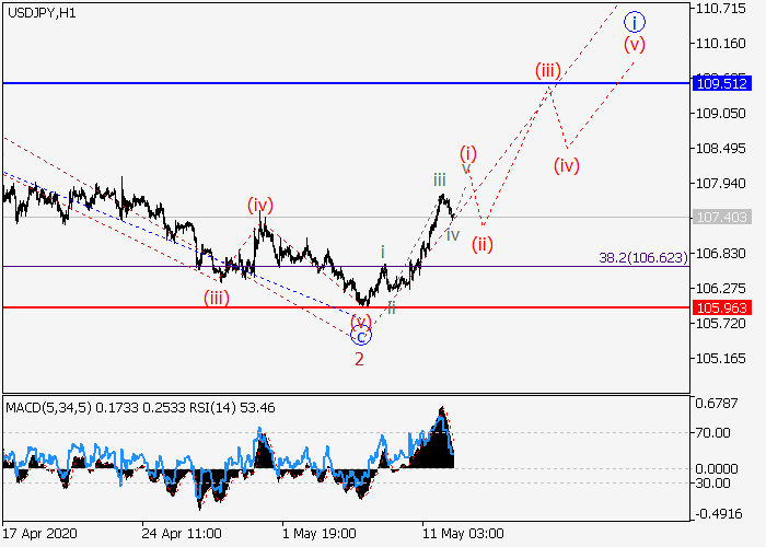 4小时图中,较高水平的下行波B已形成,上行波C已开始发展,其中C的(1)的第一波1已形成。目前,下行修正已发展为(1)的2波,(1)的波3正开始形成,其中3的i的较低水平(i)的第一个入市波正在发展。如果假设真奇怪,价格将会继续升至109.51–111.80。该情况的关键止损水平为105.96。