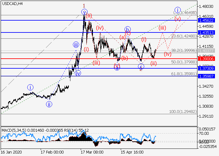4小时图中,较高水平(3)的第三波继续发展,其中(3)的第一波1已形成,下行修正作为(3)的第二波2已发展。目前,(3)的第三波3已开始形成,其中3的i的较低水平(i)的第一个入市波已形成,3的i的局部修正(ii)已完成,i的波(iii)已开始发展。如果假设正确,价格将会继续升至1.4351–1.4562。该情况的关键止损水平为1.3900。