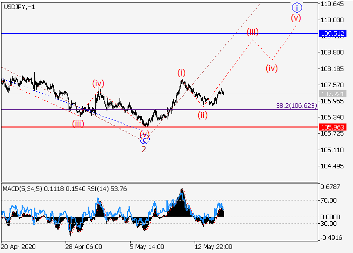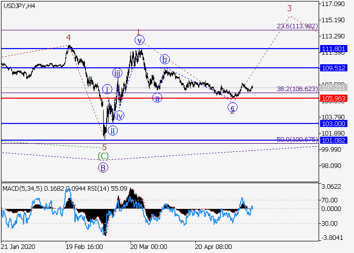 4小时图中,较高水平的上行波C在发展,其中C的(1)的第一波1已形成,修正已形成为(1)的波2。目前,(1)的波3正开始发展,其中3的较低水平i的第一个入市波正在发展。如果假设正确,价格将会升至109.51–111.80。该情况的关键止损水平为105.96。