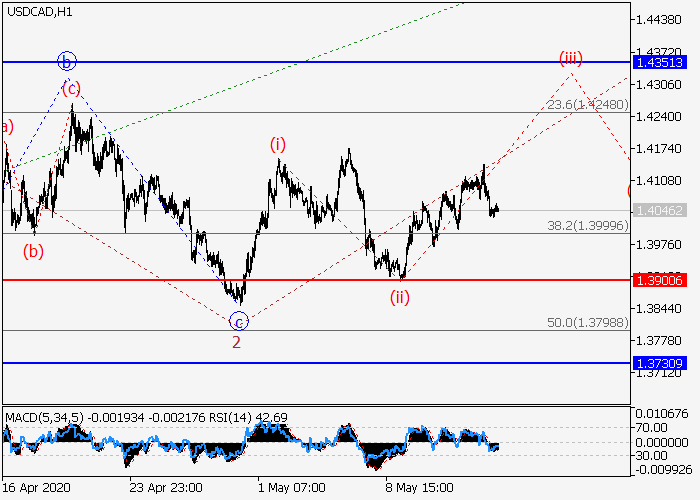 4小时图中,较高水平(3)的第三波在发展,其中(3)的第一波1已形成,下行修正已发展为(3)的第二波2。目前,(3)的第三波3已开始形成,其中3的i的局部修正(ii)已结束,i的波(iii)正在发展。如果假设正确,价格将会升至1.4351–1.4562。该情况的关键止损水平为1.3900。
