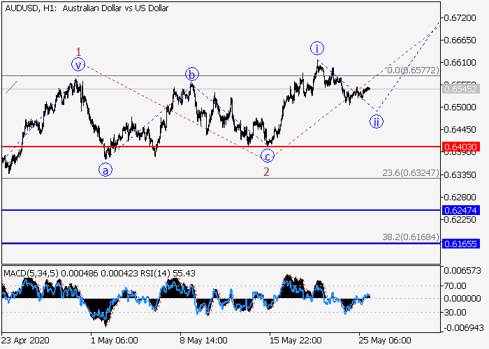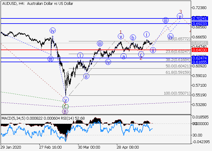 4小时图中,下行修正作为波B已完成发展,波C已开始形成,其中C的(1)的第一波1已形成。目前,下行修正作为(1)的2波已完成发展,(1)的3的第三波已开始形成,其中3的波i已形成,3的较低水平ii的局部修正正发展。如果假设正确,修正结束后,价格将会继续升至0.6923–0.7024。该情况的关键止损水平为0.6403。