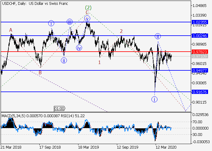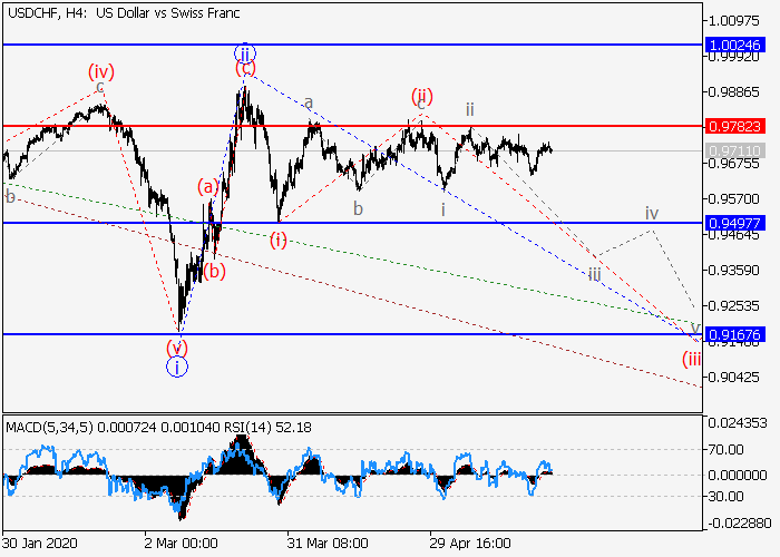 日线图中,(3)的较高水平3的第三波正在发展,其中3的波i已形成,修正结束为3的波ii。目前,3的较低水平iii波已开始发展,其中局部修正已形成为3的iii的波(ii),iii的波(iii)已开始发展。如果假设正确,价格可能会跌至0.9497–0.9167。该情况的关键止损水平为0.9782。