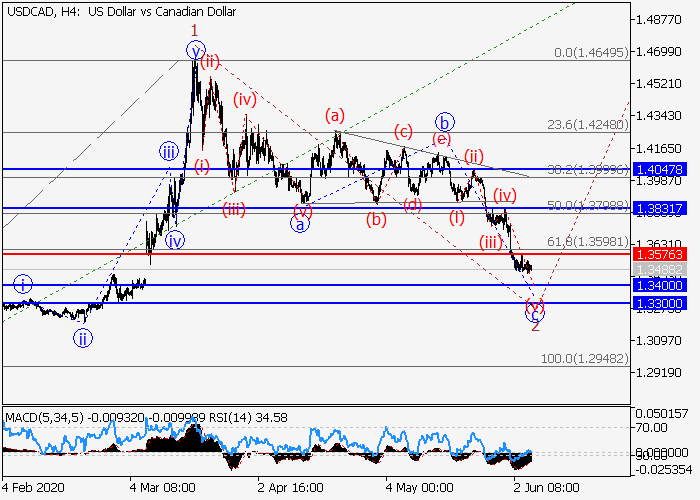 4小时图中,较高水平(3)的第三波在发展,其中下行修正发展为(3)的第二波2。目前,2的波c正在发展,其中c的波(v)正在形成。如果假设正确,价格将会跌至1.3400–1.3300。该情况的关键止损水平为1.3576。