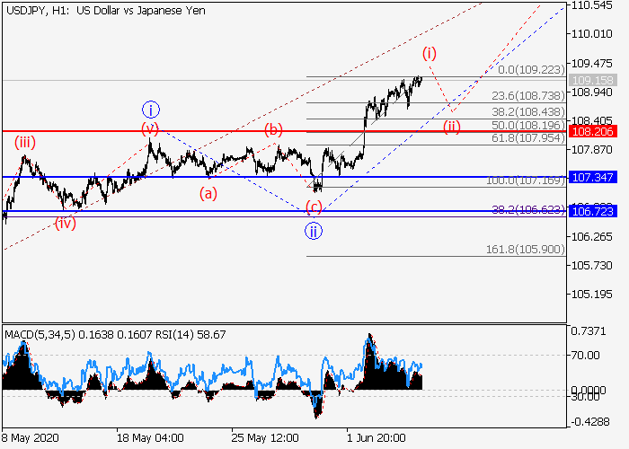 4小时图中,较高水平的上行波C在发展,其中C的(1)的第一波1已形成,修正发展为(1)的波2,(1)的波3已开始形成。目前,3的较低水平i的第一个入市波已形成,3的局部修正ii已结束,3的波iii正在发展。如果假设正确,价格将会升至110.75–111.80。该情况的关键止损水平为108.20。