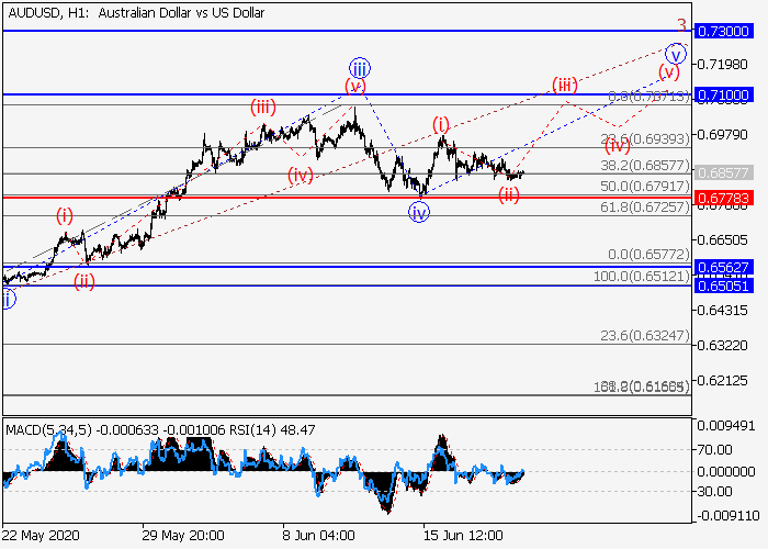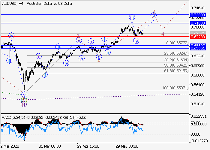 4小时图中,下行修正已发展为波B,波C已开始形成,其中C的第一波(1)形成。目前,(1)的第三波3正形成,其中较低水平的3的波iii已形成,局部修正已结束为3的波iv,3的波v正在发展。如果假设正确,价格将会升至0.7100–0.7300。该情况的关键止损水平为0.6778。