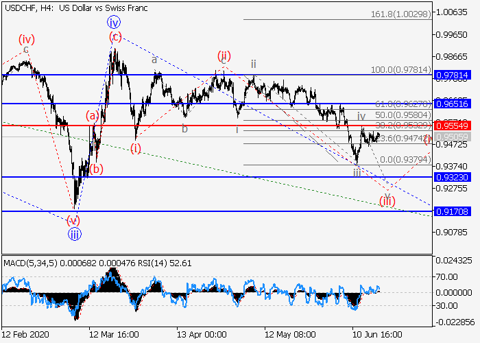 日线图中,较高水平(3)的第三波发展,其中,(3)的波1形成。目前,1的较低水平(iii)的第三波正在发展,其中(iii)的波iii已形成,局部修正已结束为iii的波(iv)。如果假设正确,价格将会跌至0.9323–0.9170。该情况的关键止损水平为0.9554。