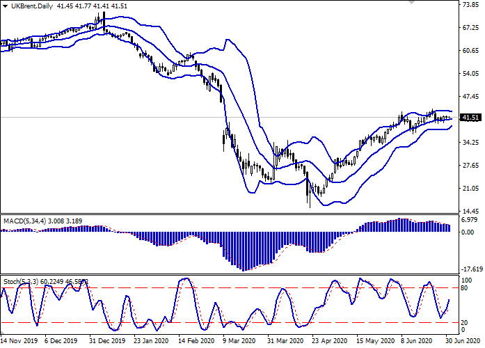日线图上,布林带呈平面动态。价格区间由下逐渐收窄,反映出过去几天交易的不确定性。平滑异同移动平均线下跌,保持弱卖出信号(图柱低于信号线)。随机指标呈增长趋势,与观察到的动态相关性不大。