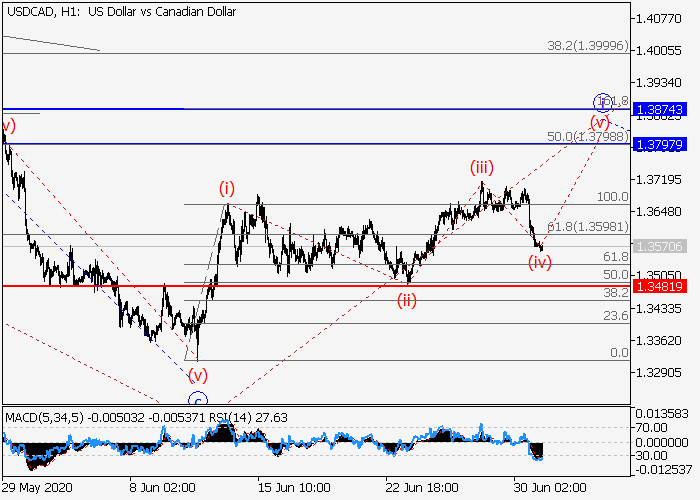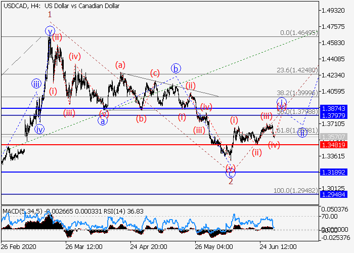 4小时图中,较高水平(3)的第三波在发展,其中下行修正已发展为(3)的第二波2。目前,3的较低会怕i的第一个入市波正形成,其中局部修正正结束为i的波(iv)。如果假设正确,价格将会升至1.3797–1.3874。该情况的关键止损水平为1.3481。