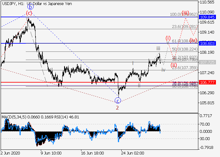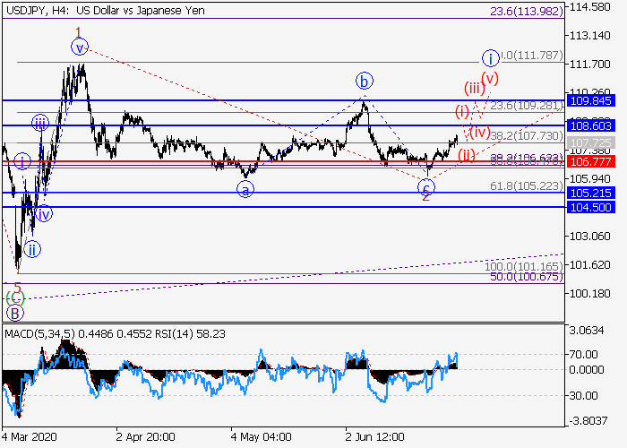 4小时图中,较高水平的上行波C在发展,其中C的(1)的第一波1已形成,修正已发展为(1)的波2。目前,3的较低水平i的第一个入市波正在发展,其中i的波(i)正形成。如果假设正确,价格将会升至108.60–109.84。该情况的关键止损水平为106.77。