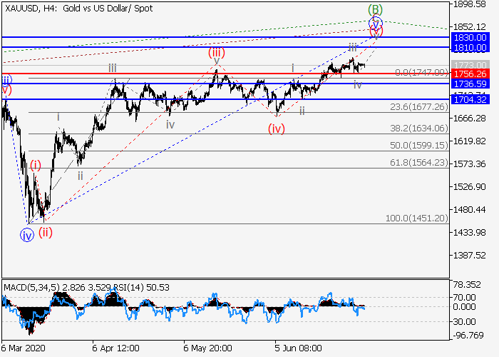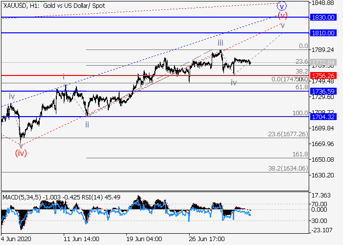 4小时图中,较高水平的上行修正发展为波(B),其中(B)的C的第五波v形成。目前,v的较低水平(v)的第五波正在发展,其中,局部修正已结束为(v)的波iv,(v)的波v已开始发展。如果假设正确,价格将会升至1810.00–1830.00。该情况的关键止损水平为1756.26。