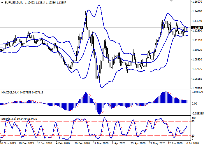 日线图中,布林带呈平面动态。价格区间由上开始扩大,为看涨趋势打开了前往局部新高的通道。平滑异同移动平均线已反转增长,形成了新的买入信号(位于信号线上方)。随机指数保持坚定上行,逐渐接近其高点。