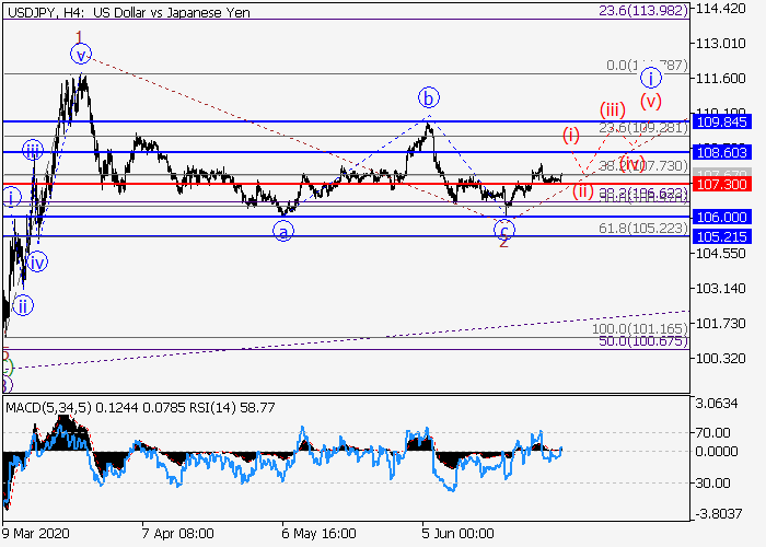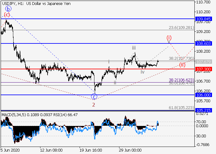 4小时图中,较高水平的上行波C形成,其中,C的(1)的第一波1已形成,修正已结束为(1)的波2。目前,3的i的较低水平(i)的第一个入市波正在发展,其中,(1)的波v正形成。如果假设正确,价格将会升至108.60–109.84。该情况的关键止损水平为107.30。