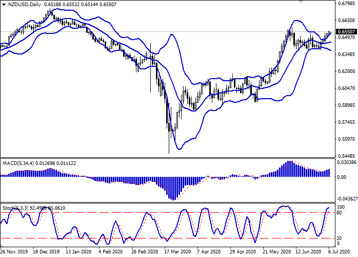 日线图上,布林带略有增长。价格区间正在扩大,但不及看涨情绪发展的那么快。平滑异同移动平均线指标正在增长,保持买入信号(图柱位于信号线上方)。随机指数接近高点,水平逆转,反映新西兰元可能在超短期内超买。
