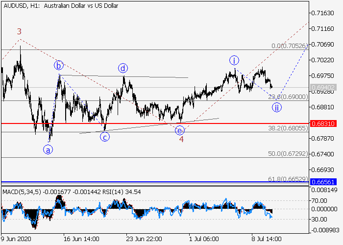 4小时图中,C的较高水平(1)的第一波在发展,其中局部修正已发展为(1)的第四波4,呈三角形。目前,(1)的第五波5已开始形成,其中5的局部修正ii正结束。如果假设正确,价格将会升至0.7200–0.7400。该情况的关键止损水平为0.6831。