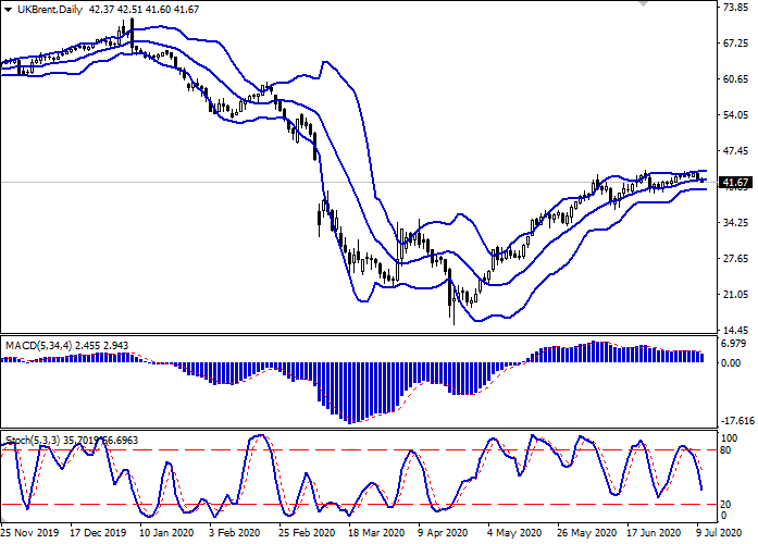 日线图中,布林带在水平面上反转。价格区间由上略微扩大,使看涨趋势刷新了局部高点。平滑异同移动平均线指标正在增长,保持弱买入信号(图柱位于信号线以上)。随机指数下行反转,超短期内发可能会修正下降。