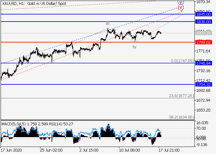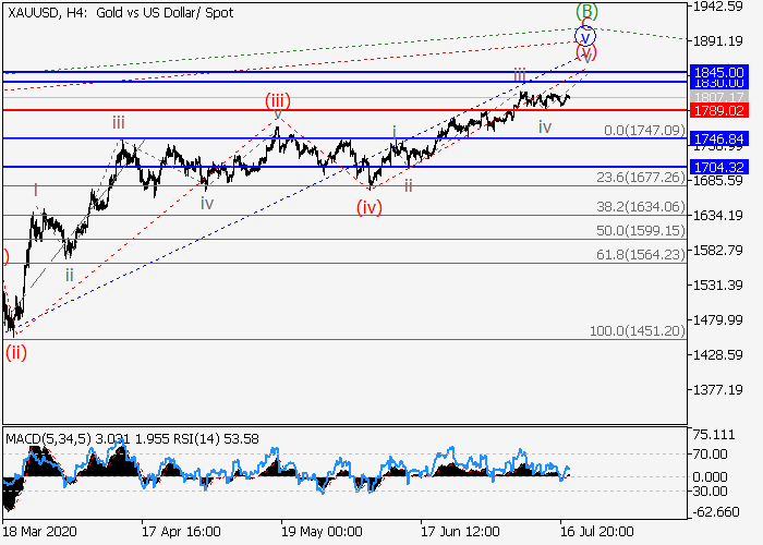 4小时图中,(B)的C的较高水平v的第五波在发展,其中C的v的波(v)形成。目前,较低水平的局部修正已发展为(v)的波iv,(v)的波v已开始发展。如果假设正确,价格将会将会升至1830.00–1845.00。该情况的关键止损水平为1789.02。