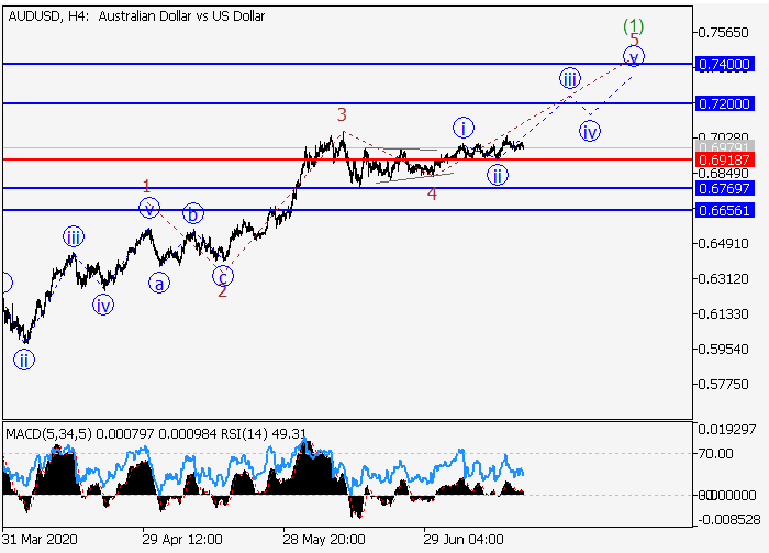 4小时图中,C的较高水平(1)的第一波在发展,其中局部修正已发展为(1)的第四波4。目前,(1)的第五波5已开始形成,其中5的修正波ii已结束,5的第三波iii正在发展。如果假设争取,价格将会升至0.7200–0.7400。该情况的关键止损水平为0.6918。