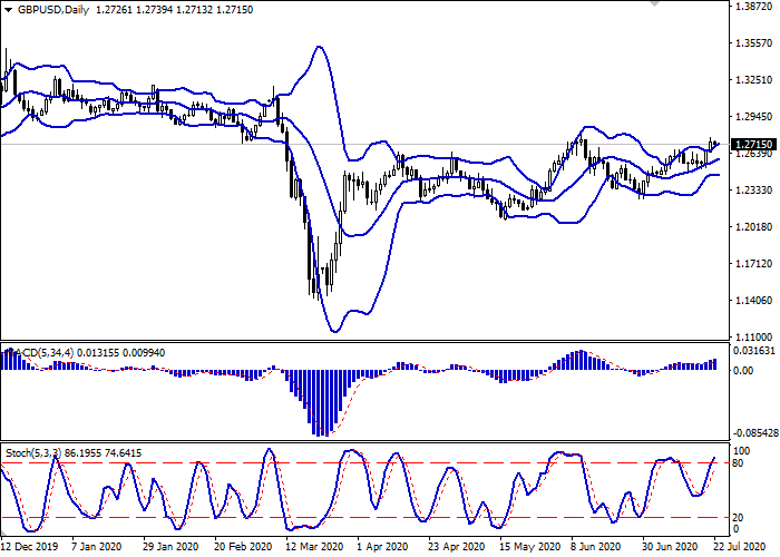 日线图中,布林带呈适度增长。价格区间由上略微扩大,但还不及看涨趋势的发展。平滑异同移动平均线指标增长,保持稳定的买入信号(位于信号线上方)。随机指数维持上升趋势,但位于其高点附近,显示超短期内英镑存在超买风险。