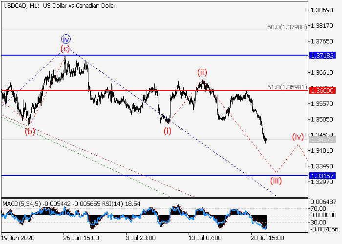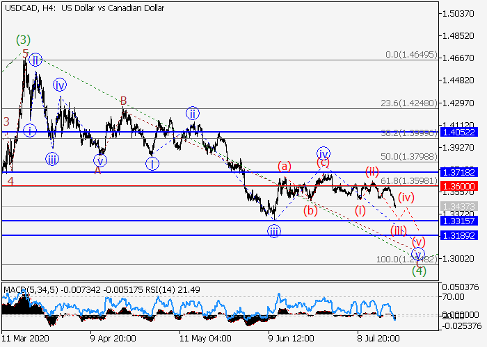 4小时图中,较高水平的下行修正发展为第四波(4),其中(4)的波C形成。目前,C的较低水平v的第五波正形成,其中v的波(iii)正形成。如果假设正确,价格将会跌至1.3315–1.3189。该情况的关键止损水平为1.3600。