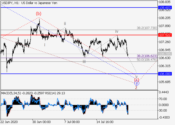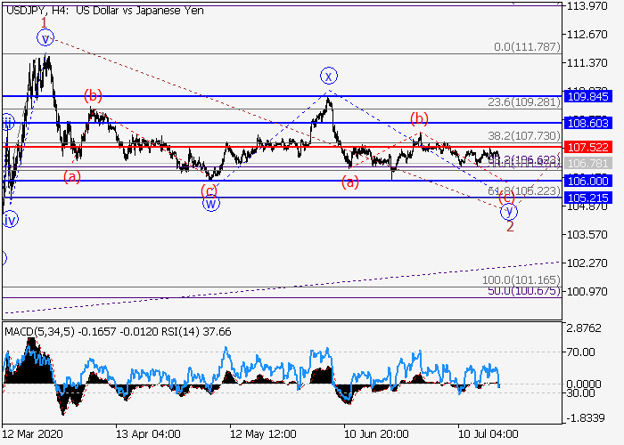 4小时图中,较高水平的下行修正发展为波2,呈双Z字型wxy,其中2的波y形成。目前,2的y的波(c)正在发展,其中(c)的局部修正iv已结束,(c)的波v正形成。如果假设正确,价格将会跌至106.00–105.21。该情况的关键止损水平为107.52。