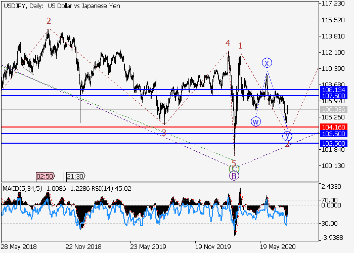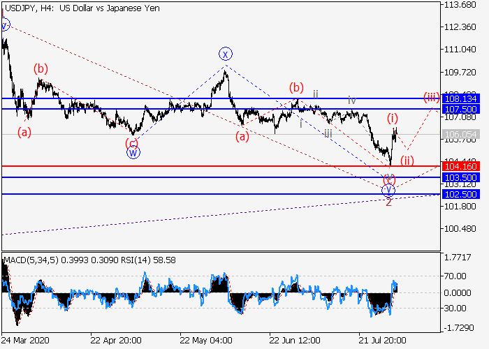 日线图中,较高水平的下行修正已发展为波2,呈双Z字型wxy,其中2的波y已形成。目前,波3正开始发展,其中,3的i的较低水平(i)的第一个入市波已形成。如果假设正确,该货币对将会升至107.50–108.13。该情况的关键止损水平为104.16。