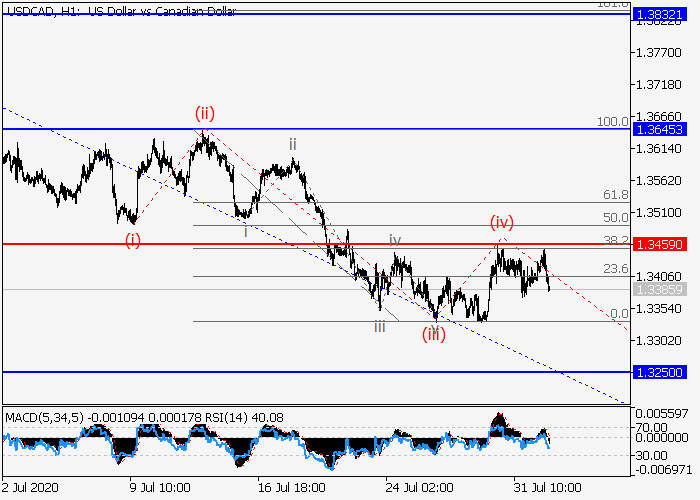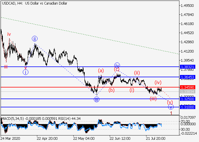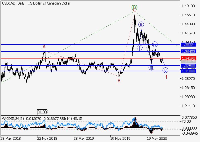 日线图中,较高水平的波(B)已发展,较低水平(C)已开始形成。目前,(C)的较低水平1的第一波正在发展,其中1的波v正形成。如果假设正确,价格将会跌至1.3250–1.310。该情况的关键止损水平为1.3459。
